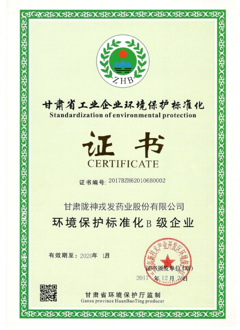 公示:公司榮獲甘肅省工業(yè)企業(yè)環(huán)境保護(hù)標(biāo)準(zhǔn)化B級(jí)企業(yè)證書