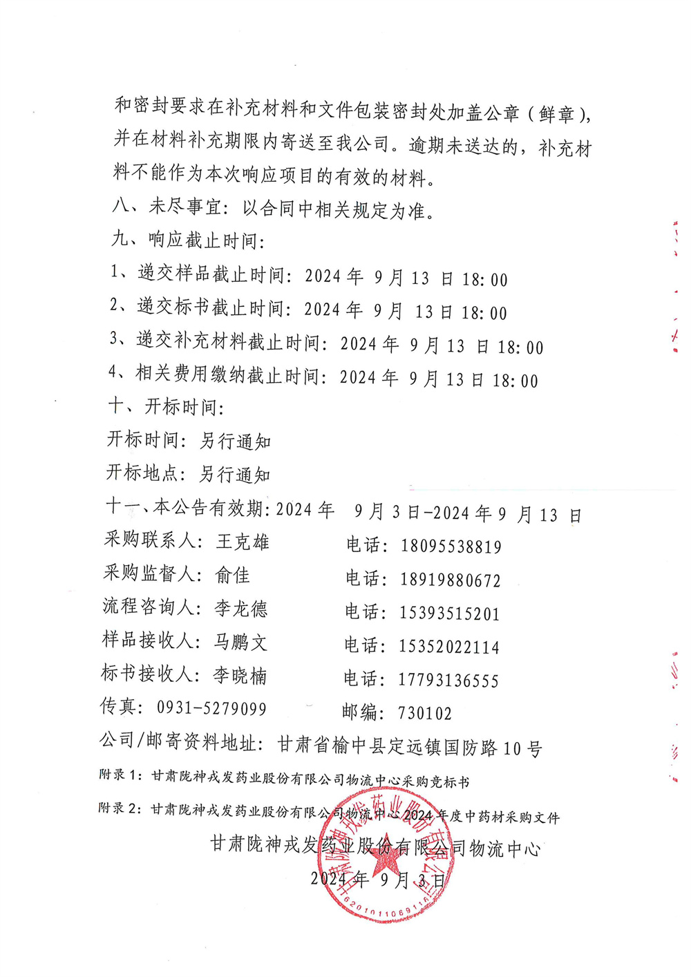 甘肅隴神戎發(fā)藥業(yè)股份有限公司物流中心2024年度中藥材招標采購公告