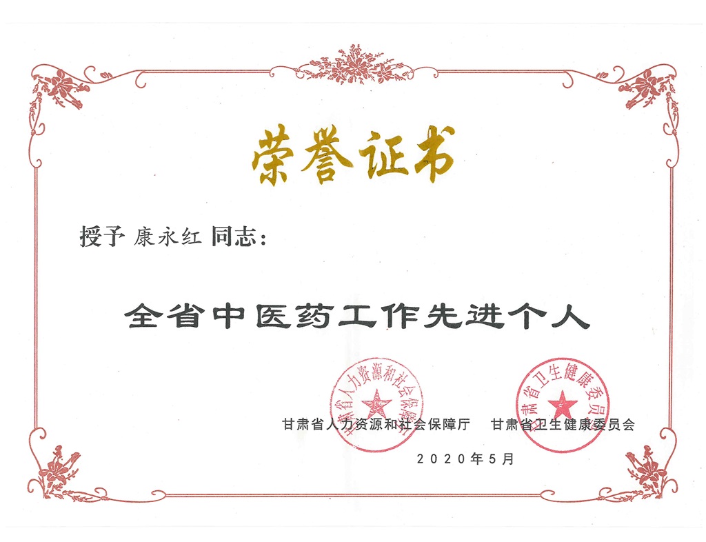 隴神戎發(fā)康永紅同志榮獲“全省中醫(yī)藥工作先進(jìn)個(gè)人”