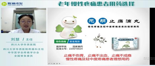 19日下午正式開展線上“慢性疼痛與輕中度疼痛專家交流會(huì)”,首場(chǎng)直播邀請(qǐng)到中華醫(yī)學(xué)會(huì)疼痛學(xué)會(huì)分會(huì)全國常務(wù)委員、四川大學(xué)華西醫(yī)院疼痛科主任劉慧教授主講《老年慢性疼痛患者用藥選擇》,劉主任強(qiáng)調(diào)老年患者往往會(huì)存在肝腎功能不全等問題,目前廣泛使用的NSAIDs類藥物會(huì)導(dǎo)致消化道、心血管、肝腎功能的不良反應(yīng),而元胡止痛滴丸止痛不傷胃、止痛不出血、止痛不成癮的優(yōu)勢(shì)更適用于老年慢性疼痛。