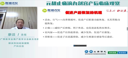 線上交流會(huì)第二場(chǎng)邀請(qǐng)到廣西醫(yī)學(xué)會(huì)圍產(chǎn)醫(yī)學(xué)分會(huì)副主任委員、柳州市婦幼保健院產(chǎn)科主任廖滔教授主講《元胡止痛滴丸剖宮產(chǎn)后臨床觀察》,廖滔主任從病理生理過程講解產(chǎn)后疼痛的特點(diǎn)、從病理生理進(jìn)行藥物分析,從止痛的機(jī)理講解元胡止痛滴丸促進(jìn)產(chǎn)后恢復(fù)的優(yōu)勢(shì),最后從臨床實(shí)例分享元胡止痛滴丸使用的效果。