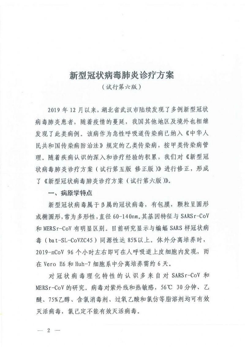 關于印發(fā)新型冠狀病毒感染的肺炎診療方案(試行第六版)的通知