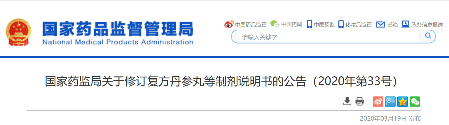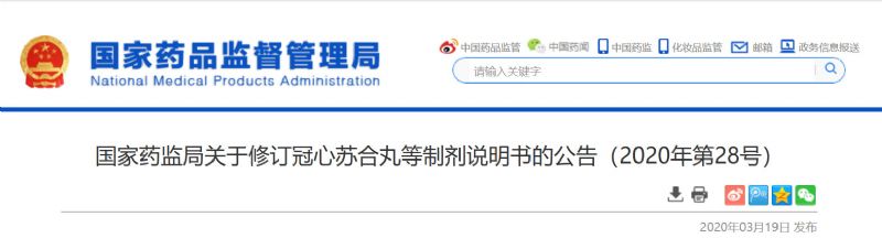 3月19日,國(guó)家藥品監(jiān)督管理局對(duì)復(fù)方丹參丸,包括復(fù)方丹參丸、復(fù)方丹參片、復(fù)方丹參膠囊、復(fù)方丹參軟膠囊、復(fù)方丹參腸溶膠囊、復(fù)方丹參噴霧劑(復(fù)方丹參氣霧劑)、復(fù)方丹參顆粒、復(fù)方丹參滴丸、復(fù)方丹參口服液等制劑,冠心蘇合丸等制劑11個(gè)品種說(shuō)明書(shū)進(jìn)行統(tǒng)一修訂。