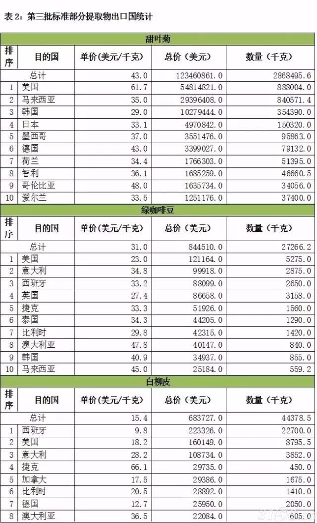 此外記者留意到,2016年,我國提取物出口排名前十的品種包括:甜菊提取物、桉葉油、薄荷醇、甘草提取物、萬壽菊提取物、辣椒色素、越橘提取物、蕓香苷及其衍生物、橙皮苷、桂油等。但桉葉油、薄荷醇、甘草,提取物等這些排名靠前的品種還不在目前25個已有標準的名單中。